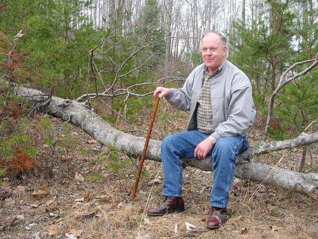 Two years ago Pa decided to hike with us into the wood at the head of Grapevine – to see what was left of the school he went to in 1942. The mountain had swallowed it up years before I was born. None of us were sure he could find it. But he did. (More on this later.) Here he stops to rest his leg.